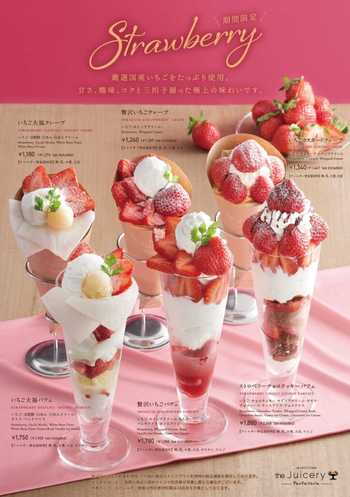 厳選した旬の国産いちごをふんだんに使用したパフェやクレープ、